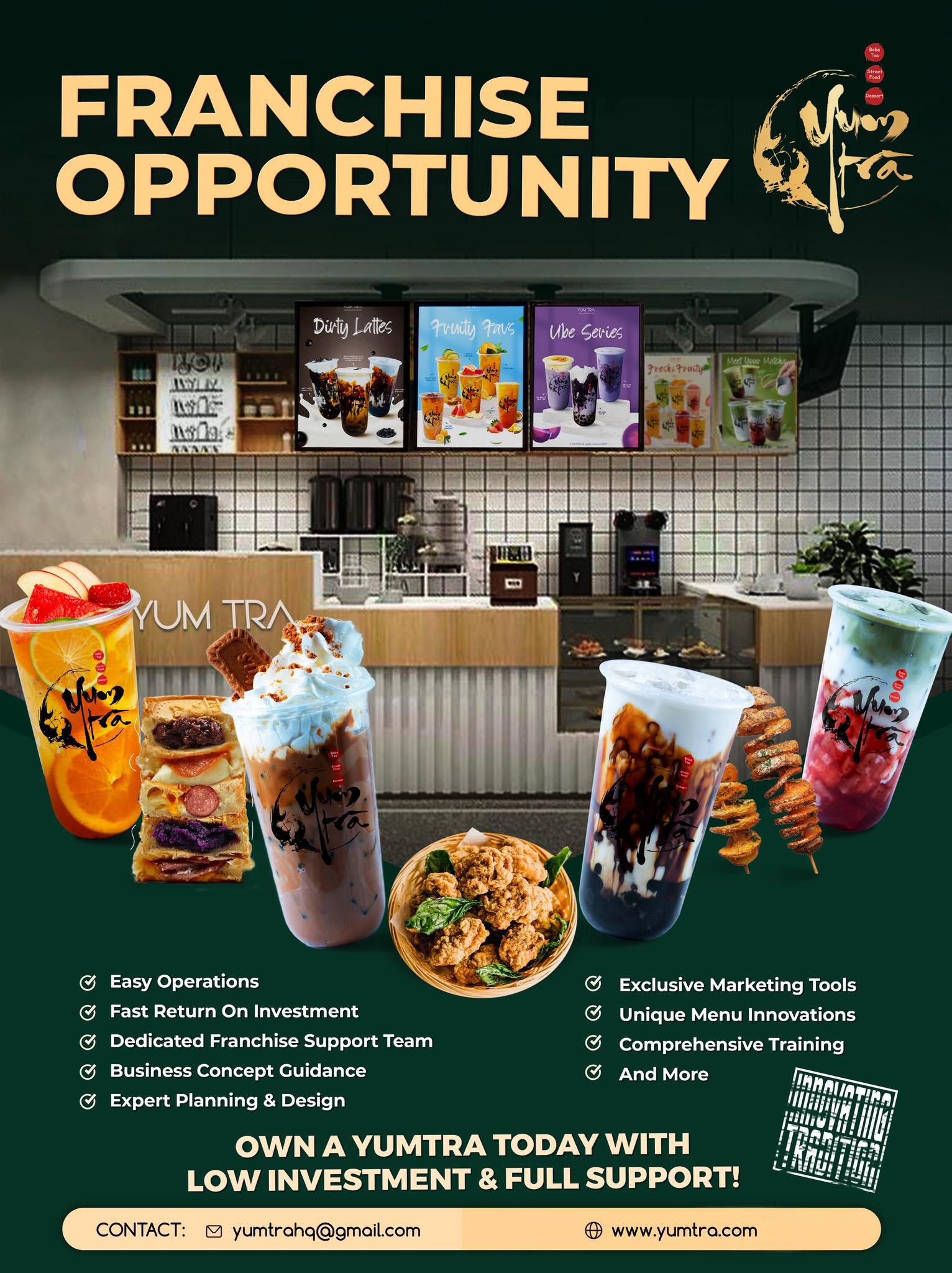 Boba lovers & foodies — do you dream of one day running your own shop? Discover the ultimate experience with Yum Tra! Dive into a world of vibrant flavors, delightful drinks, & scrumptious street food. Our franchise is more than just a drink or snack—it’s an experience, promising high-quality ingredients, innovative recipes, and exceptional customer service. Whether you’re an entrepreneur looking to join a thriving industry or a boba enthusiast eager to share your passion, our franchise offers comprehensive support, from training to marketing, ensuring you succeed and delight customers in your community.